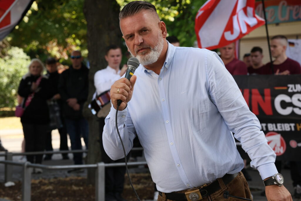 Thorsten Heise beim Aufmarsch von «Die Heimat» gegen den CSD in Magdeburg am 23. August 2025 – Quelle: Pixelarchiv
